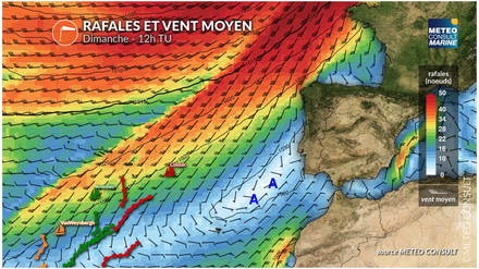 Il doit en profiter avant que le flux plus faible (entre 10 et 15 noeuds) ne tourne au secteur ouest puis nord-ouest à l’arrière, devenant de travers et donc moins portant pour avancer.