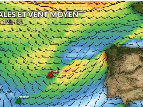 Pour Amedeo et Van Weynbergh, la situation reste compliquée après avoir eu un peu d’air, ils devraient être rattrapés par la dosale ce mardi. En revanche, dès mercredi, une dépression va filer du nord-ouest vers la Galice, avec des vents forcissant à plus de 30 à 35 noeuds. Cette dépression pourrait leur permettre d’accélérer leur cap temporairement.