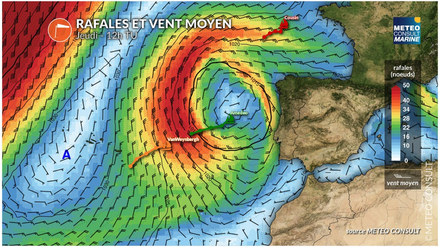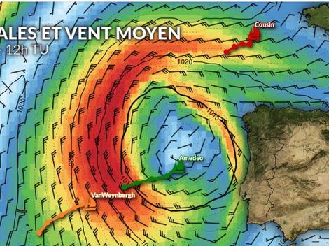 Pour Amedeo et surtout Van Weynbergh, la situation reste complexe au large du Portugal, avec l’arrivée d’une dépression active par le nord-ouest qui les obligera à la contourner. Van Weynbergh devra faire avec des vents forts à plus de 30 à 35 noeuds de secteur nord-nord-ouest, ce qui l’obligera à longer la côte portugaise en remontant, ce qui risque d’allonger encore sa route interminable.