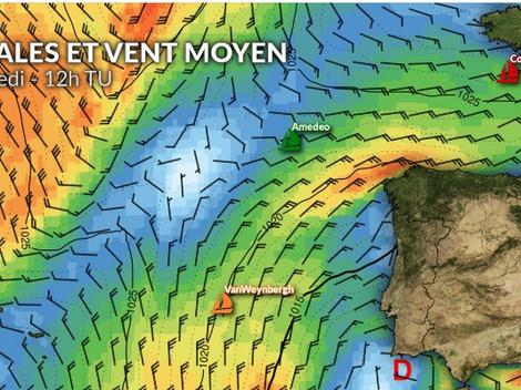 Il conservera ce type de flux jusqu’à l’arrivée prévue lundi, en milieu de journée. Van Weynberg progressera ces prochains heures dans un flux de nord soutenu de 20-25 noeuds puis ce flux tournera au secteur nord-est en se renforçant. Il prendra sûrement l’option d’une navigation côtière le long du Portugal pour se mettre à l’abri des vents les plus forts.