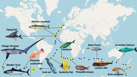 Parmi les espèces détectées par le capteur à bord, on note une grande diversité de poissons à l’image de la richesse du parcours autour du monde : des dorades à long filament et à queue de fouet, des maquereaux espagnols, des poissons cardinal fantôme, poissons papillons à long bec, des saumons australiens, des thons fuselés, des poissons alligators arctiques, des anguilles, mais également des poissons qui figurent sur la liste des espèces menacées de l’UICN (Union Internationale pour la conservation de la nature), par exemple le requin-renard pélagique connu pour assommer ses proies à coup de queue en forme de fouet .