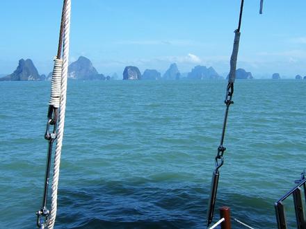 En toute saison, la baie de Phang Nga conserve des vents modérés et des eaux calmes, offrant des abris sûrs. Le long des plages ou au fond d’une crique, les mouillages abondent. Pour explorer les lieux, un dinghy ou un canoë permettent de se faufiler dans les grottes ou dans les canaux de la mangrove qui peuple le nord et l’est de la baie. Ici, se trouvent des villages traditionnels de pêcheurs, dont le plus célèbre, Koh Panyi est entièrement bâti sur pilotis. Amicaux, les habitants proposent aux navigateurs crabes et crevettes. En faisant route vers le sud, on croise l'îlot Koh Tapu qui mesure 20 mètres de hauteur. Il est devenu célèbre depuis 1974, date à laquelle il apparaît dans un film de James Bond, L'Homme au pistolet d'or. L’îlot est désormais appelé James Bond Island. Dernière escale sur l’île de Koh Hong. Elle doit son nom à la présence d’un magnifique lagon accessible uniquement depuis la mer via un étroit passage entre les falaises qui l’entourent. À marée haute, les voyageurs s’y baignent. À marée basse, le lagon révèle ses secrets marins, coraux, étoiles de mer et crabes bleus. Tout simplement magique.