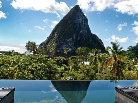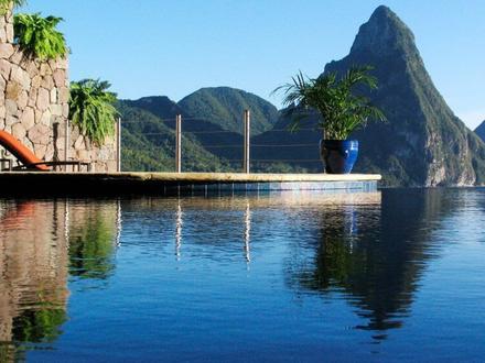 Jade Moutain est un hôtel grand luxe situé sur l'île dans Sainte-Lucie dans les Caraïbes. Et les prestations sont incroyables : chaque chambre dispose de sa propre piscine privée ! Et pour varier les plaisirs, quelques brasses dans la piscine à débordement, avec vue sur le volcan de Grand Piton et Petit Piton... et sur la mer turquoise également.