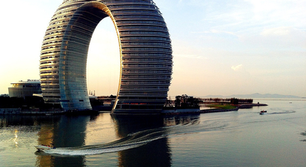 Situé à Huzhou dans le centre-est de la Chine, cet hôtel mise clairement sur l'originalité. Rien que de l'extérieur, il annonce la couleur avec son arche de 101 mètres de hauteur ! Il est presque un monument à lui tout seul !