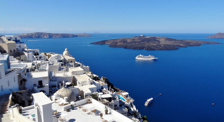 L'île de Santorin, en mer Méditerranée, est connue dans le monde entier pour ses maisons bleues et blanches, adossées à la falaise. Denombreuses croisières font escale à Santorin, et beaucoup de bateaux y mouillent.