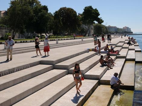 Midi sonne aux cloches de la ville. Depuis le beffroi de la cathédrale, Saint-Donnat la Byzantine dévoile ses dessus de tuiles. Le temps de dévaler les marches et l’on se mêle aux badauds, sur le front de mer. Un bateau passe. Son sillage approche. D’un coup, la digue se met à chanter. Assis sur les gradins, au ras de l’eau, un verre de marasquin (*) à la main, on regardera le soleil tourner en écoutant ces étranges sirènes. « Elles chantent sur sept tons, pour deux accords majeurs » souffle un passant : « Le choix des tons et des gammes est basé sur ceux des chansons de « klapa », les chants traditionnels dalmates, polyphonies a capella. » Ainsi les sons varient, créant une musique toujours nouvelle et originale composée par les vents, les vagues et les marées.