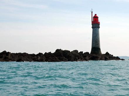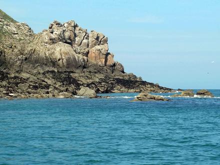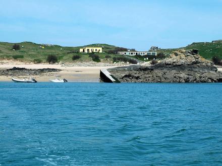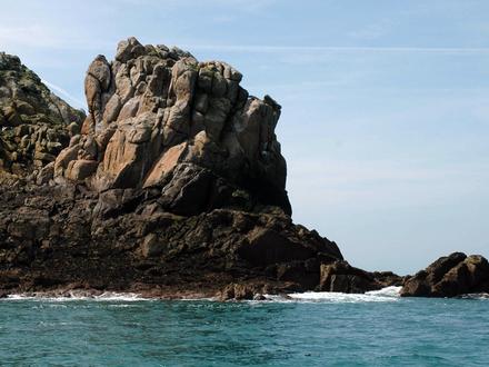 Orientée SW, NE, elle est divisée en deux plateaux séparés par une profonde faille. Sa longueur totale n’est que de 700 m, pour une largeur de 250 m avec un point culminant à 40 m environ. Pendant la dernière guerre, elle a été pilonnée par plus de 20 000 bombes et on y dénombre des milliers de cratères. Ce qui a deux conséquences, les promenades sont limitées à l’intérieur de l’île (beaucoup de zones interdites) donc cela favorise la présence de nombreux oiseaux comme les goélands, les mouettes, les cormorans, les pétrels et quelques pingouins de la famille des Torda. Ces pingouins de couleur noir et blanc sont une espèce protégée. Il en reste peu en Manche, la principale colonie est en Islande.