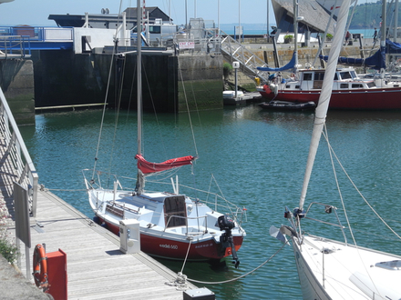 Le bassin à flot est doté d’un système de porte à bascule. La porte s’ouvre à marée montante à la cote 8.80 m et se referme à la cote 9 m (marée descendante). Les horaires sont calculés pour une pression atmosphérique de 1013 hPa et peuvent varier. Vous pouvez vous renseigner à la capitainerie (0296736186 ou sur le canal VHF 9). Une signalisation lumineuse indique le fonctionnement des portes : 3 feux rouges fixes superposés passage impossible, clignotants danger (manœuvre de porte), 3 feux verts passage autorisé. A l’ouverture des portes, les bateaux sortants sont prioritaires, les bateaux en attente dans l’avant-port doivent stationner le long des quais et dégager le chenal. Les bateaux qui n’ont pas de place attribuée à l’année doivent accoster au ponton visiteur à tribord après les portes. Pour permettre le franchissement du bassin (piétons et véhicules) un pont mobile est manœuvré par un agent du port. Les bateaux entrants et sortants du bassin doivent indiquer à l’agent leur intention de passage pour qu’il le manœuvre. Pour cela, il suffit soit de se présenter en attente dans le chenal soit de contacter la capitainerie (canal 9). A l’ouverture/fermeture de la porte, un courant important se crée dans le sas. Avec un bateau faiblement motorisé, il est souhaitable d’attendre que le courant se stabilise. De même, il est déconseillé d’entrer au dernier moment car un fort courant sortant peut se manifester. Attention, pour entrer ou sortir du port, il faut une hauteur minimum (9 m). Par exemple au mois d’août 2021, les 2/3/4/5 août (coefficient de marée de 36 à 45, hauteur de 8.20 m à 8.80 m) ces hauteurs d’eau ne sont pas suffisantes pour passer.