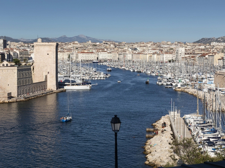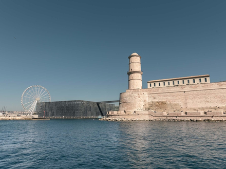 Les sentinelles sont nombreuses quand on approche la ville depuis la mer. La plus au large est l’île du Planier avec son haut phare, le regard tourné vers la haute mer. En progressant vers le Nord, ce sont les îles du Frioul qui forment une protection insulaire. Le Château d’If voulu par François 1er pour renforcer la défense de cette ville stratégique, s’interpose encore avant de pouvoir poser le pied sur le continent. Sur tribord, de petites barques de pêche entrent et sortent du Vallon des Auffes, port miniature, carte postale pittoresque au pied des immeubles. Passé la Digue des Catalans, l’entrée se dessine. Surtout ne pas se laisser embarquer dans l’axe du port de commerce. L’intense trafic de ferries qui relie l’Europe à l’Afrique du Nord donne pourtant une première note comme épicée à cette escale. Mais non, toujours de nuit, il faut se glisser sur la droite, au pied du Palais du Pharo et se laisser immédiatement subjugué par la dentelle de béton illuminée de bleu du MUCEM. Musée des Civilisations de l'Europe et de la Méditerranée, quel plus beau symbole pouvait vous accueillir à Marseille ? Son architecte, Rudy Ricciotti, a ciselé son bâtiment de manière merveilleuse, en faisant immédiatement un des symboles de la ville. Qu’il l’ait relié par une passerelle vertigineuse à l’historique Fort St Jean a sans aucun doute participé à cette fulgurante appropriation.
