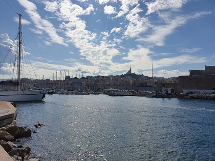 Sans remonter jusqu’à la préhistoire, c’est un abri protégeant naturellement de la mer qui a convaincu les Grecs originaires de Phocée d’y installer un comptoir, il y 2 600 ans. A bord de leurs navires conjuguant propulsion vélique et rames, ils commercent le long des côtes Méditerranéennes. Ils sont séduits par les qualités topographiques de cette longue et vaste calanque, parfaitement orientée (Est-Ouest) pour se protéger du vent déjà dominant, soufflant du Nord, le Mistral : la Baie du Lacydon, l’actuel Vieux Port. La première ville de France est née. Au fil des siècles la ville a envahi les collines environnantes, mais au loin, les plus hautes montagnes continuent à détourner les rafales. Au Sud, La Bonne Mère, tout d’or revêtue, brille de jour comme de nuit. Elle veille sur la ville en général et sur les navigateurs en particulier. On la repère de loin, surtout de nuit, sans doute le meilleur moment pour approcher celle que les Romains ont baptisé Massilia.