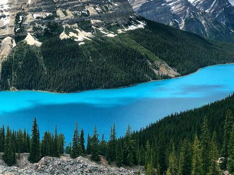 Le parc national de Banff et les Rocheuses canadiennes possèdent de nombreux lacs splendides. Parmi eux, le lac Peyto et le lac Moraine, tous les deux d'un bleu turquoise glacé, sublimé par les montagnes autour. Les deux lacs se situent à 1 880 m d'altitude. Le lac Peyto est accessible par la promenade des glaciers, qui amène également à d'autres lacs. Quant au lac Moraine, il est rempli de glace et n'atteint son niveau maximal que la deuxième quinzaine de juin. Il prend alors une teinte bleue à cause de la réfraction de la lumière sur la poussière de roche en suspension dans l'eau.