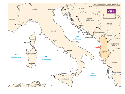 L'Albanie borde la partie Sud de la côte occidentale de la mer Adriatique. Si le pays est surtout montagneux, la bande littoral est plutôt étroite mais plsuieurs villes et marinas se sont développées et s'ouvrent au tourisme. Le port principal du pays est celui de Durrës; suivi de Sarandë, Vlorë et Shëngjin. Durrës est surtout un port d'escale pour une navigation plus au sud de l'Albanie et la mer Adriatique.