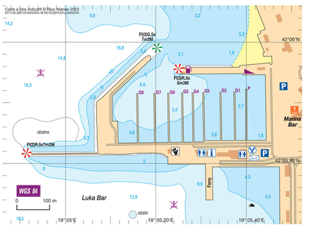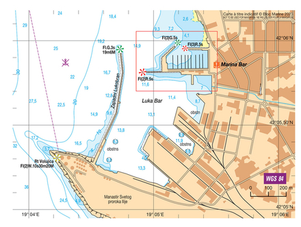 Coordonnées entrée du port : latitude : 42°05,973'N / longitude : 19°05,228'E