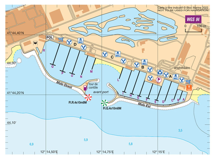 Coordonnées entrée du port : latitude : 41°44,177'N / longitude : 12°14,723'E