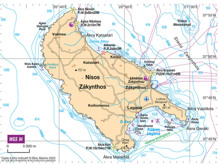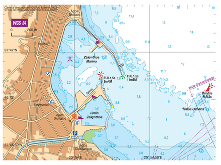 Coordonnées entrée du port : latitude : 37°46,867'N / longitude : 20°54,253'E