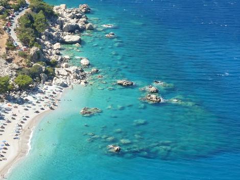Commençons par la plage d'Apella, sur l'île de Karpathos, située entre la Crète et Rhodes. La plage se situe à 18 km au nord de Pigadia, la capitale de l'île. Karpathos est une île très montagneuse et c'est ce qui donne ce charme fou à la plage : du sable blanc, une eau turquoise dominés par les falaises boisées. Pour vous rendre sur la plage, le moyen le plus simple est de prendre le bateau depuis Pigadia.