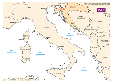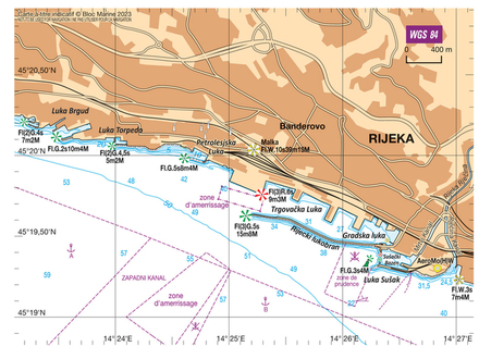 Coordonnées entrée du port : latitude : 45°19,700'N / longitude : 14°25,230'E