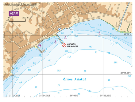 Coordonnées entrée du port : latitude : 38°31,90'N / longitude : 21°04,85'E