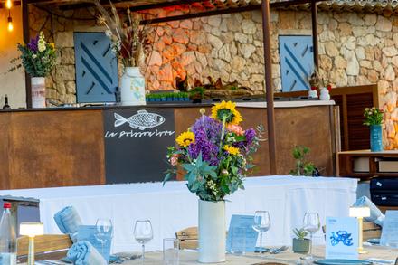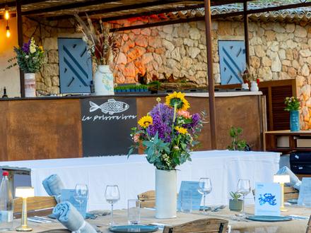 Jean-Baptiste Battini s’est associé à Hugo Mancel pour créer un accueil chaleureux et authentique grâce à une équipe de passionnés qui veulent imprimer leur état d’esprit positif et généreux que l’on va retrouver dans leurs plats préparés avec finesse, expérience et créativité. Dans cette ambiance hors du temps, on peut déjeuner le midi et déguster de délicieux plats, durant toute la saison, à l’ombre des pins, bercé par le chant des cigales. Pour une expérience encore plus intense, Hugo et Jean-Baptiste ont décidé de proposer une aventure gastronomique quatre soirs par semaine, du mercredi au samedi, autour d’un menu unique et qui change chaque semaine. Le soir, le restaurant n’accueillera que 25 convives afin de conserver une ambiance intimiste et partager des moments de convivialité entre bons vivants. Une grande table centrale sera dressée pour rappeler le banquet d’Ulysse.