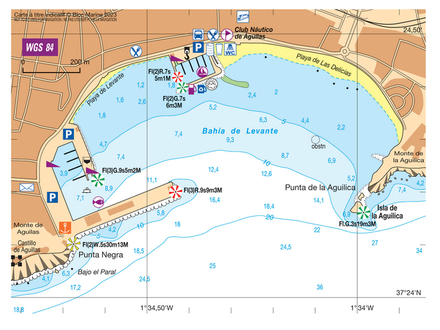 Coordonnées entrée du port : latitude : 37°24,19N / longitude : 01°34,20'W