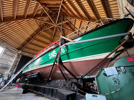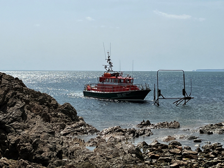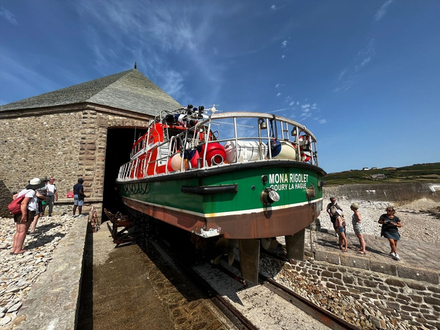 Malgré ses 25 tonnes, il pivote sur son chariot à l’intérieur de l’abri. Il peut ainsi emprunter soit la rampe de lancement du port à marée haute, soit celle menant directement en pleine mer lorsque la marée est basse. C’est par cette porte qu’est rentré dimanche dernier le « Mona Rigolet ». Après avoir accompagné le prologue de la Drheam Cup à Cherbourg le samedi, son équipage revenait de Jersey, où les échanges avec leurs homologues de la RNLI qui œuvrent sur la même zone, sont permanents. Les touristes se pressaient nombreux pour voir le chariot dévaler la pente jusqu’à l’eau. La vedette usait alors de ses deux moteurs de 400 chevaux, qui la propulsent habituellement à 20 nœuds, pour s’y hisser, l’étrave bien dans l’axe de la perche lui servant de repère. Deux coups de corne de brume signifient à la station qu’ils peuvent actionner le treuil. La lente remontée peut commencer, mais le travail de son équipage, qui varie de 4 à 8 personnes selon les missions, n’est pas terminé pour autant. Il faut penser à abaisser les antennes VHF, ainsi que support de radome radar, ils ne passent pas dans l’embrasure de la porte. Un dernier arrêt avant d’entrer permet de chasser le sel d’un rapide jet d’eau douce. Le canot est désormais à l’abri sous la très belle charpente octogonale en bois, prêt pour sa prochaine mission. Il suffira de 10 minutes pour rassembler hommes et femmes bénévoles qui n’habitent pas à plus de 10 minutes de la station, et en seulement 5 minutes il sera à l’eau.