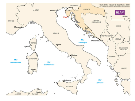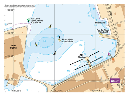 Coordonnées entrée du port : latitude : 44°53,329'N / longitude : 13°47,564'E