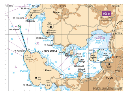La passe d’accès à Luka Pula est comprise entre : Rt Proština (Pointe Cristo), pointe basse qui porte une balise lumineuse (44°53,4' N - 13°47,9' E) et une station de signaux ; et à 500 m au SW, la balise lumineuse qui se dresse à l’extrémité du brise-lames enraciné dans Rt Kumpar.