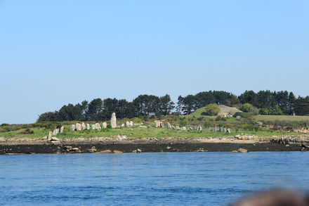 Quelques encablures plus loin, Er Lannic se devine à peine derrière les vagues. Sur cette petite île battue par les vents subsiste un double cromlec’h, deux cercles de pierres levées, dont une partie disparaît sous les flots à marée haute. Découvert au XIXe siècle, ce site mégalithique vieux de 3 500 ans fascine par son énigme : pourquoi ces alignements partiellement engloutis ? Était-ce volontaire ?
