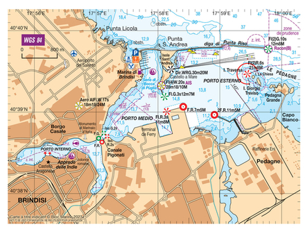 Coordonnées entrée du port : latitude : 40°39,627'N / longitude : 17°59,658'E