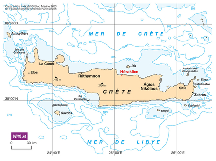 Coordonnées entrée du port : latitude : 35°21,015'N / longitude : 25°09,275'E