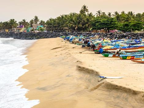 Pondichéry est un lieu unique au monde à l’atmosphère incomparable. Des rues pavées, des plaques d’odonymes en français, des joueurs de pétanque et des Églises catholiques, voilà un décor hors normes dans ce petit bout d’Asie situé sur la côte de Coromandel. La région étant particulièrement chaude, la température moyenne est de 32°C, idéale pour une baignade tout au long de l’année.