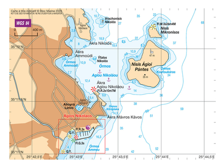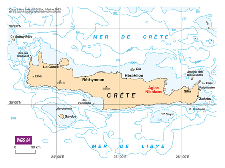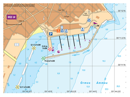 Coordonnées entrée du port : latitude : 35°11,146'N / longitude : 25°43,00'E
