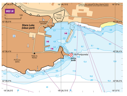- Approche : Rt Porporela au sud du port : jetée avec balise lumineuse (42° 38,4' N - 18° 07,1' E). Un brise-lames détaché protège l’entrée du port.