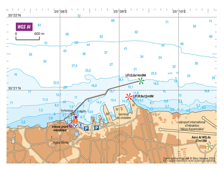 Coordonnées entrée du port : latitude : 35°21,015'N / longitude : 25°09,275'E