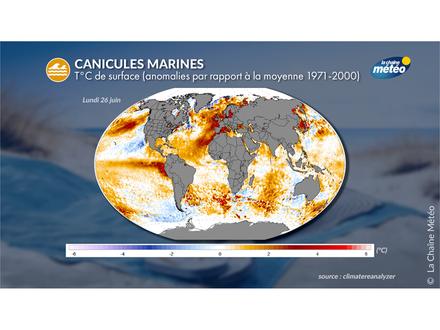 Depuis le début juin, les températures océaniques de l'Atlantique Nord et de la Méditerranée sont de 2 à 4°C supérieures aux moyennes de saison, et localement jusqu'à +5°C comme dans le golfe de Gascogne actuellement. Mais, d'une façon globale, les températures océaniques planétaires sont plus élevées que la normale. Le terme de "vague de chaleur marine" a été utilisé pour mettre en exergue ce phénomène, "lorsque la température de surface de la mer est plus élevée que 90% du temps pendant plus de cinq jours", selon Raphaël Seguin, biologiste marin à l'UMR Marbec de l'Université de Montpellier.