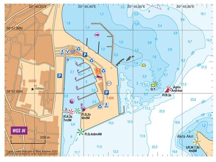 Coordonnées entrée du port : latitude : 38°57,470'N / longitude : 20°45,350'E
