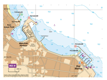 Coordonnées entrée du port : latitude : 36°53,594'N / longitude : 27°18,045'E