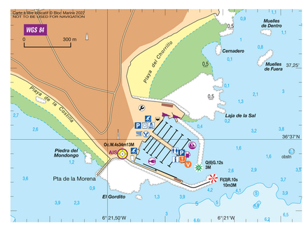 Coordonnées entrée du port : latitude : 36°36,885'N / longitude : 06°21,075'W