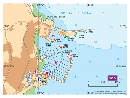 Coordonnées entrée du port : latitude : 43°21,658'N / longitude : 08°14,577'W