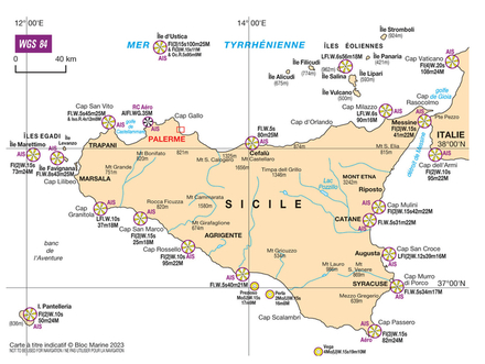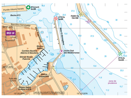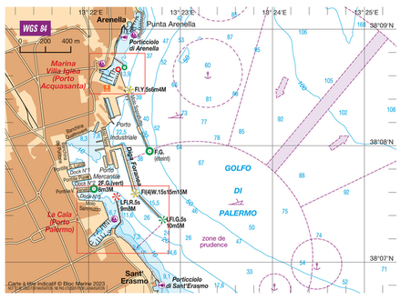 Coordonnées entrée du port : latitude : 38°07,536'N / longitude : 13°22,233'E