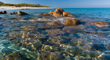 Pile au Sud de la Sardaigne, cette plage pourrait se trouver dans les Caraïbes. Mais la Méditerranée se rappelle à nous car Terrueda est bordée de maquis méditerranéen.