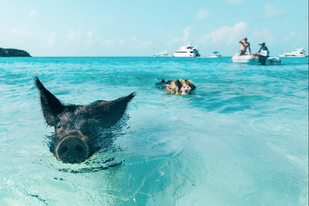 Au programme : Thunderball Grotto, Big Major Cay, Bitter Guana Cay & Great Guana Cay. Votre première escale de la journée sera Thunderball Grotto, célèbre lieu de tournage du James Bond Opération Tonnerre : à découvrir à marée basse, sinon, vous risquez de ne pas trouver l'entrée. C'est parti pour une session nage jusqu'à l'intérieur de la grotte. Il y a beaucoup de courant, mais une corde est installée pour pouvoir profiter du spectacle en toute sécurité. Ensuite, cap sur Big Major Cay et la plage de Pig Beach pour rencontrer les célèbres cochons nageurs. Après les cochons, les iguanes :