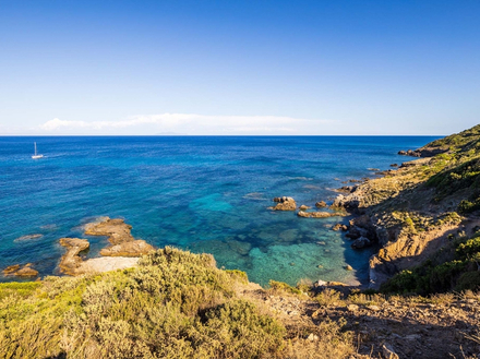 La plage de Macinaggio, directement accessible au nord du port (570 places, équipements et services), marque le départ du sentier. Sur sa partie orientale, jusqu'à l'île de la Giraglia et ses deux hameaux sentinelles Barcaggio et Tollare, il serpente en douceur le long de plages de sable fin, dans les dunes et le maquis bas. La grande plage de Tamarone offre une première halte. Puis les îles Finocchiarola apparaissent : la réserve naturelle est le repaire des goélands d'Audoin (principal site de nidification de l'espèce), cormorans huppés et balbuzards pêcheurs. Pour préserver ces lieux de reproduction et de migration, le débarquement sur l'archipel des Finocchiarola est interdit du 1er mars au 31 août et le mouillage est impossible toute l’année dans un rayon de 200 mètres autour des îles. Poursuivez ensuite votre balade jusqu'à la rade de Santa Maria : sa chapelle est l'une des dernières à double abside et sa tour génoise, en partie effondrée (mais toujours les pieds dans l'eau), classée monument historique, est l'une des quinze sentinelles de schiste encore debout le long des côtes capcorsines (sur la trentaine construite à partir du XVIe siècle). Elle complète un décor paradisiaque : blancheur du sable, eaux turquoise qui viennent lécher le vestige et au large l'île toscane de Capraia. Dans la continuité, les plages de sable de Genovese (et ses vaches débonnaires) et de la cala Francese invitent, elles aussi, à la pause baignade ou farniente. En poursuivant jusqu'à la pointe et la tour d'Agnello, la côte devient plus découpée, davantage travaillée par les éléments. Enfin, point d'arrivée du premier itinéraire, la marine de Barcaggio, à l'extrême nord du cap. Face à elle, l'imposante île de la Giraglia, surmontée de son phare et de sa tour génoise, défie les éléments.