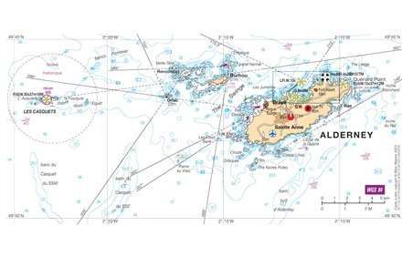 Par l’est de Jersey, il y a un passage difficile appelé Violet Bank. C’est plein de cailloux, mais bien balisé et bien hydrographié sur les cartes GPS. Puis en faisant route vers le nord, on traverse les Ecréhous et les Dirouilles. Il faut bien sûr être vigilant dans ces parages et ne pas se laisser distraire par la magie des lieux, mais ce n’est pas piégeux. L’arrivée par Quénard Point avant d’embouquer le chenal qui vous mène dans le port de Fort-Braye est impressionnante parce qu’on voit un peu partout des marmites que forme le courant. Dans le port bien protégé par une digue, tout est calme sauf par vent de nordet. Un coffre vous sera attribué par les autorités portuaires qui viennent à votre rencontre. Il suffit de saisir le bout relié au coffre et de s’amarrer par l’avant et au moyen de ce bout. N’utilisez pas vos propres amarres. Pas d’inquiétude, tout est solide, les longueurs sont calculées comme il convient, personne ne va se toucher. On voit rarement plus simple...