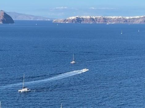 Les bateaux, ce sont ceux que les loueurs mettent sur le marché et ceux qu’on appelle les promène-couillons. Eh bien vive les promène-couillons ! En effet, prendre un bateau en location, c’est aussi prendre un risque. On ne se familiarise pas aussi vite avec un bateau qu’avec une auto. Donc, avant de prendre la mer et de diriger un bateau, il faut entendre et comprendre les directives du loueur dans la langue qu’il parle, le grec ou l’anglais, jamais le français, payer la location et surtout avancer la caution qui au moindre accroc vous sera retenue. Tandis que si vous embarquez sur un bateau conduit par un skipper professionnel, vous n’irez peut-être pas où vous voulez, mais les parcours proposés sont les plus intéressants qui soient et vous n’aurez qu’à vous laisser conduire et admirer les paysages sans la responsabilité du chef de bord. La plupart de ces bateaux sont des catamarans à voiles d’un peu plus ou un peu moins de 40 pieds. Mais tous ne naviguent qu’au moteur et pas seulement par pétole ou vent fort, par tous les temps... Ce n’est pas une règle, c’est plutôt un usage. Hisser les voiles, c’est du boulot, c’est un peu plus de contraintes pour les personnes embarquées, alors, sauf demande expresse d’un groupe de voileux, les balades dans la caldeira se font au moteur. On se demande pourquoi les bateaux sont équipés d’un gréement de voiliers... Car c’est beaucoup de poids et donc de consommation de carburant pour rien sinon pour faire joli. Il est vrai que pour attirer le touriste, il faut aussi faire joli...