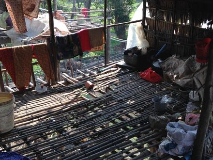 Sur invitation, une mère de famille ouvre les portes de sa maison perchée. L’échange est limité par la barrière de la langue, mais les gestes suffisent. L’intérieur est sommaire : un étage supérieur pour dormir, protégé des crues, et un niveau inférieur, plus ouvert, servant de cuisine et d’espace de vie. Le sol en bambou tressé laisse filtrer l’air et la lumière, tandis que les murs en bois brut offrent peu d’intimité mais une précieuse ventilation naturelle.