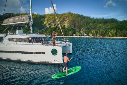 Son design unique, à coque monomaran (entre monocoque et catamaran), sans quille et avec un tirant d’eau réduit à 0,85 mètre, permet d’accéder à des zones de mouillage plus confidentielles. Le confort à bord n’est pas en reste : vue panoramique à 360°, cuisine extérieure, quatre cabines avec salle de bain, cabine équipage, espaces de détente pensés pour un accès direct à la mer.