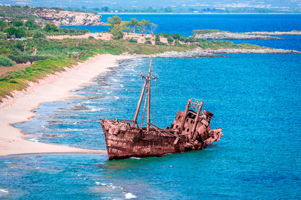 À quelques kilomètres de Gythio, sur la plage de Valtaki, repose l’épave emblématique du Dimitrios. Ce petit cargo grec s’est échoué en 1981 dans des circonstances encore entourées de rumeurs - certains évoquent des activités de contrebande. Depuis, sa carcasse rouillée, couchée sur le sable doré, captive les visiteurs. Accessible facilement à pied, le lieu dégage une atmosphère à la fois romantique et mystérieuse, renforcée par la mer turquoise et les collines arides de Laconie.