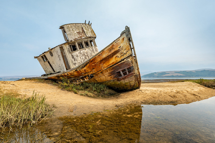 Loin des grands ports, l’épave du Point Reyes trône au nord de la baie de Tomales, en Californie. Ce vieux bateau de pêche en bois, abandonné dans les années 1970, est devenu une véritable icône photographique. Bien que fortement délabré, il conserve une esthétique poignante, entre nostalgie et abandon. À marée basse, on peut s’en approcher facilement pour admirer les détails de sa structure vermoulue, témoignage silencieux d’une autre époque.