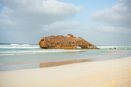 En 1968, le cargo espagnol Cabo Santa Maria, en route vers l'Amérique du Sud avec une cargaison précieuse, s'échoue sur la plage de Boa Vista au Cap-Vert. Depuis, sa silhouette rouillée repose à quelques dizaines de mètres du rivage, offrant un spectacle saisissant aux visiteurs. Accessible à pied depuis la plage, l'épave est devenue une attraction incontournable de l'île, mêlant histoire maritime et beauté naturelle.